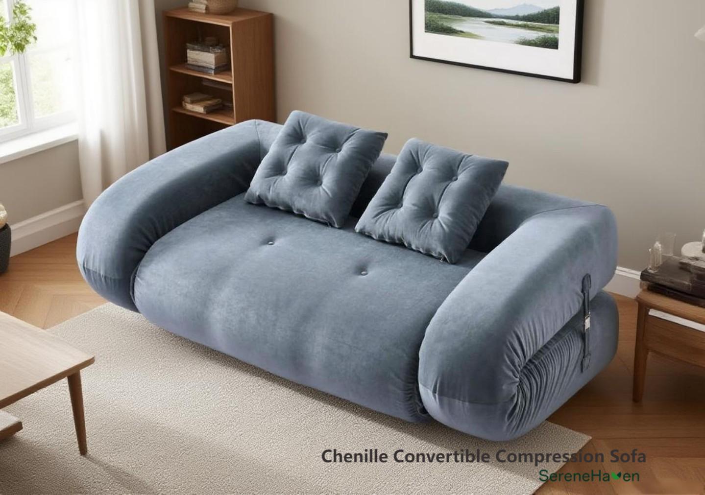 Wir stellen Ihnen das SereneHaven Chenille Cozy Compression Sofa mit Deformationsdesign vor – ein hochwertiges 2-in-1- Umbau-Schlafsofa aus luxuriösem Chenille-Stoff, das Vielseitigkeit und Komfort für moderne Wohnräume neu definiert. Dieses multifunktionale Kompressionssofa lässt sich mühelos von einer stilvollen Sitzlösung in ein Lounge-Bett und ein großes Schlafsofa verwandeln und passt sich nahtlos an Ihren dynamischen Lebensstil an. Als herausragendes Stück unserer Wohnzimmermöbelkollektion kombiniert es innovative Technik, hochwertige Materialien und elegantes Design, um jeden Raum aufzuwerten und gleichzeitig die Funktionalität zu maximieren.