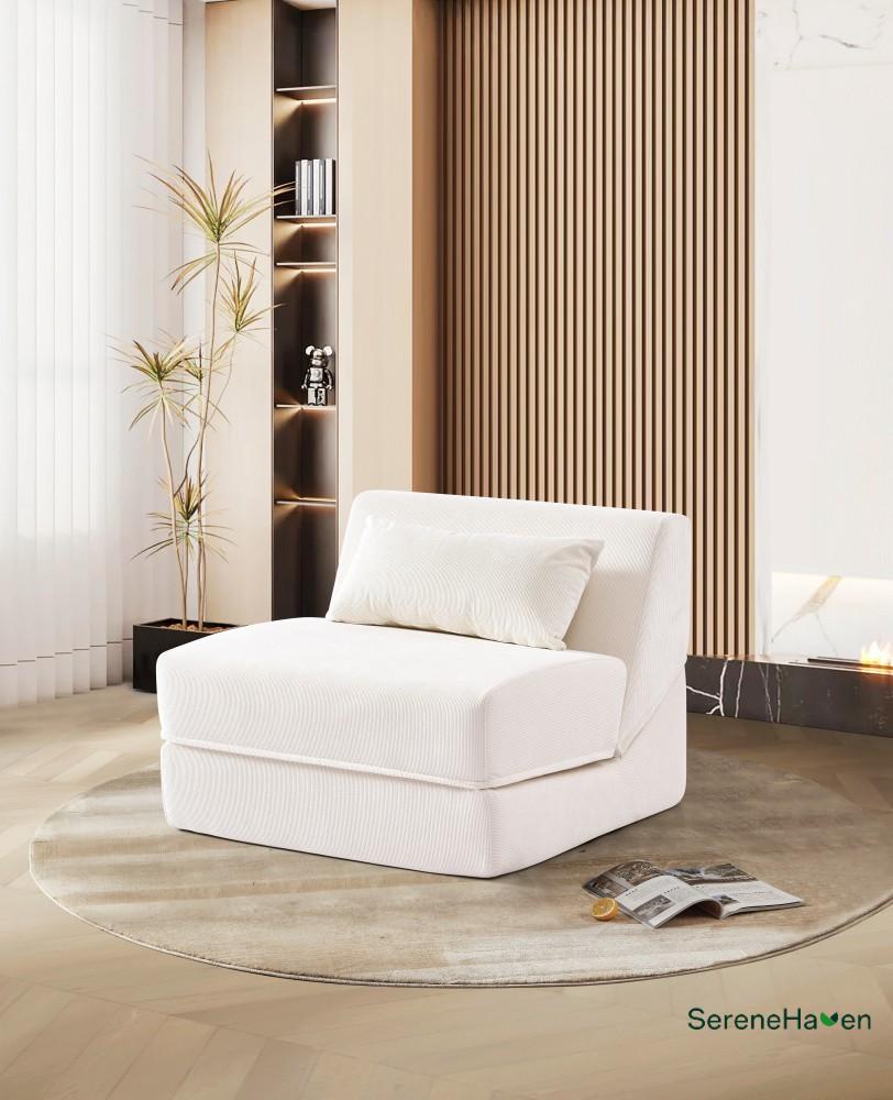Entdecken Sie das dreifach faltbare Kompressionssofa SereneHaven , eine perfekte Mischung aus Nachhaltigkeit und Funktionalität für moderne Wohnräume. Dieses innovative umwandelbare Schlafsofa vereint nahtlos die Funktionen eines Sofas, eines Bettes und einer Chaiselongue und ermöglicht eine einfache Verwandlung, um es mühelos an Ihre täglichen Bedürfnisse anzupassen – egal, ob Sie mit einem Buch entspannen, Gäste zu einem Filmabend einladen oder eine schnelle Schlaflösung benötigen. Gepolstert mit hautfreundlichem Baumwoll-Leinen-Stoff (ein Schlüsselmaterial in unserer Stoffsofa- Kollektion) und gefüllt mit hochwertigem, puderfreiem, komprimiertem Schaumstoff, bietet es außergewöhnlichen atmungsaktiven Komfort und langlebige Haltbarkeit. Sein kompaktes, platzsparendes Design ermöglicht eine Platzierung ohne Wand und ist somit die ideale Wahl für kleine Wohnungen, Heimbüros oder jeden Bereich, in dem der Platz knapp ist. Die schlichte, minimalistische weiße Ästhetik passt zu allen modernen Wohnzimmermöbeln , von Sofagarnituren bis hin zu eleganten Sesseln, und wertet Ihre Inneneinrichtung mit dezentem Stil auf.